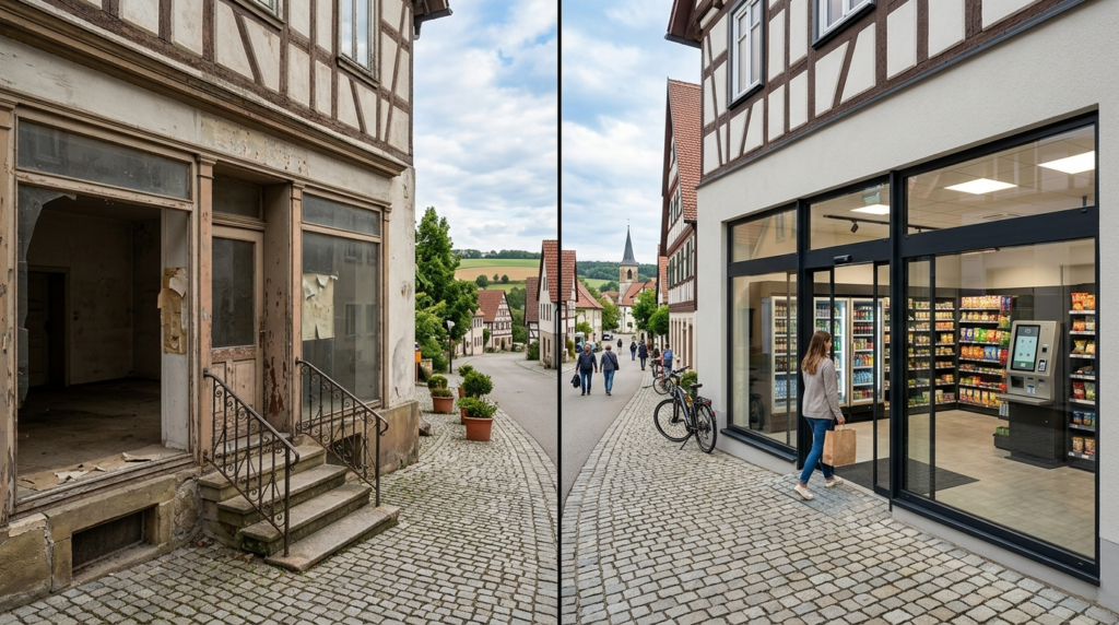 Hier liegt der vielleicht größte Vorteil. In Dorfgebieten und Mischgebieten — also genau dort, wo die meisten Smart Stores entstehen — ist ein Nahversorger unter 150 Quadratmetern planungsrechtlich willkommen. Die Gemeinde muss den Bebauungsplan nicht ändern. Es braucht kein Zielabweichungsverfahren. Der Laden passt einfach rein.